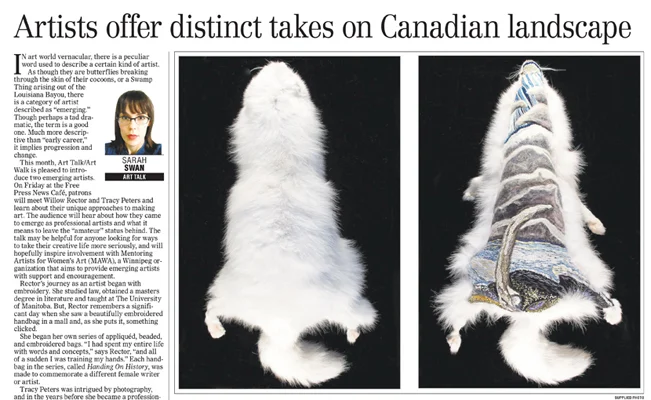Sarah Swan. "Artists offer distinct takes on Canadian landscape". Winnipeg Free Press. Sept.2,2014